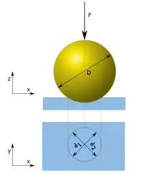 در آزمون معمولی از توپ فولادی به قطر ۱۰ میلیمتر (۰٫۳۹ اینچ) به عنوان یک فرو رونده با نیروی ۳٬۰۰۰ کیلوگرم-نیرو (۲۹ کیلونیوتن؛ ۶٬۶۰۰ پوند-نیرو) استفاده می شود. برای مواد نرمتر ، نیروی کمتری استفاده می شود. برای مواد سخت تر ، یک توپ کاربید تنگستن جایگزین توپ فولادی می شود. تورفتگی اندازه گیری می شود و سختی به صورت زیر محاسبه می شود: