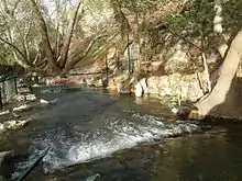 در سال 1292 هجری قمری و در اواسط سلطنت ناصرالدین شاه قاجار و بدستور وی در محل سرچشمه سراب سنگی را صاف نموده و قسمت آخر آیه 2 و قسمت اول آیه 3 سوره مبارکه طلاق را بر روی این سنگ حجاری و به یادگار گذاشته اند که متن عربی و فارسی آن دقیقا به شرح دقیقا به شرح زیر است : هوالمعز او عزیز و پرقدرت است