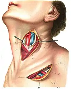 ![]() The fascia and middle thyroid veins. (Superior thyroid artery labelled at upper left.) | |