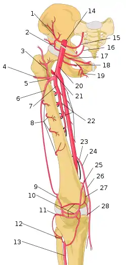 | نمای شریان فمورال (شماره ۲۰) و شاخههای مهم آن.- ران راست، نمای قدامی. | |