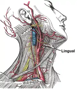 ![]() Depiction of the neck with muscles and arteries shown. The lingual artery arises from the external carotid artery | |