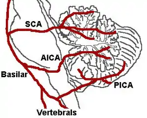 | سه سرخرگ مخچه: the SCA, AICA, and PICA. (شریان ورتبرال پایین تصویر) | |