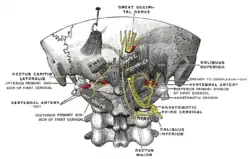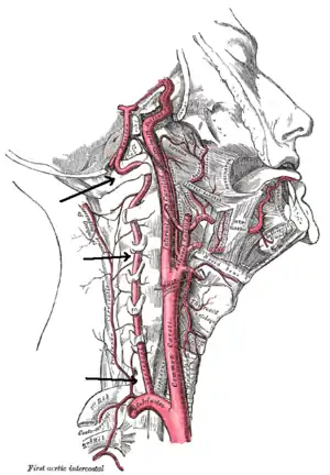 | سرخرگهای گردن. سرخرگهای مهرهای از شریان سابکلاوین سرچشمه گرفته و شریان بازیلار را میسازند. | |