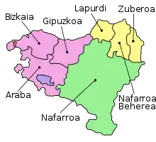 - سرزمین باسک شمالی، یا باسک فرانسه، (Iparralde, Pays Basque یا Pays Basque Nord) سه استان (تاریخی) شمالی در فرانسه (بخش زرد نقشه)