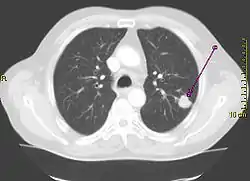 | نمونهای از تومور موجود در ریه که توسط پیکانی بر روی رادیوگرافی قفسه سینه نشان داده شدهاست. | |