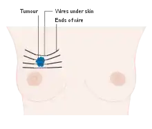 پرتودرمانی پس از عمل جراحی به ناحیه تخت تومور و گرههای لنفاوی داده میشود تا سلولهای توموری میکروسکوپی را که ممکن است از جراحی فرار کنند را از بین ببرد. ممکن است اثر مثبتی بر میکرومحیطزیست تومور داشته باشد.[54][55] پرتودرمانی میتواند به صورت پرتودرمانی خارجی یا به عنوان براکیتراپی (رادیوتراپی داخلی) صورت گیرد. بهطور معمول رادیوتراپی پس از عمل برای سرطان پستان انجام میگیرد. رادیوتراپی میتواند خطر ابتلا به بازگشت دوباره را تا ۵۰–۶۶٪ کاهش دهد.[56]