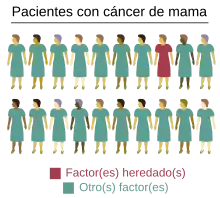 - سابقه فامیلی: سابقهٔ سرطان پستان در فامیل (تغییرات ارثی در ژنهای BRCA1 و BRCA2 (نام اختصاری برای سرطان پستان ۱ و سرطان پستان ۲) در بسیاری از مبتلایان به سرطانهای پستان و تخمدان وجود داشتهاست)[20]