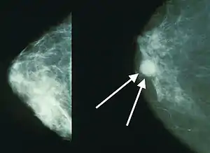 | تصویر ماموگرافی از پستان طبیعی (چپ) و یک پستان دچار سرطان (راست) | |