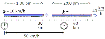 ما با حرکت نسبی در تقریب کلاسیک (یا غیر نسبی، یا تقریب نیوتنی) شروع میکنیم که همه سرعتها بسیار کمتر از سرعت نور است. این با تبدیلهای گالیله همراه است. تصویر یک مرد را در بالای قطار نشان میدهد. در ساعت ۱:۰۰ بعد از ظهر شروع به قدم زدن با سرعت ۱۰ کیلومتر / ساعت میکند. قطار هم در حال حرکت با سرعت ۴۰ کیلومتر / ساعت است. تصویر مرد و قطار را در دو زمان نشان میدهد: اول، زمانی که سفر آغاز شدهاست، و یک ساعت بعد در ساعت ۲ بعد از ظهر. تصویر نشان میدهد که مرد ۵۰ کیلومتر از نقطه شروع فاصله دارد چون یک ساعت با قطار و خودش حرکت کردهاند. این، طبق تعریف، سرعت ۵۰ کیلومتر / ساعت، که نشان میدهد که روش محاسبه سرعت نسبی در این حالت، جمع دو سرعت است.