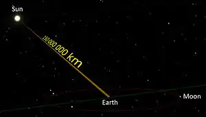 ![]() نور خورشید بهطور میانگین ۸ دقیقه و ۲۰ ثانیه طول میکشد تا به زمین برسد.[1] | |