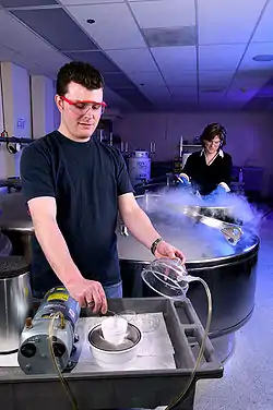 سرماداری جوانهٔ گیاه. مخزن باز نیتروژن مایع در پشت.