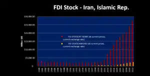 مطابق آمار اطلاعاتنامه جهان در سال ۲۰۱۰، انباشت سرمایهگذاری مستقیم خارجی در ایران به ۱۶٫۸۲ میلیارد دلار (در داخل) و ۲٫۰۷۵ میلیارد دلار در خارج رسیدهاست.[14]
