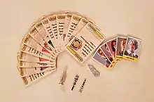 - ۲۱ عدد کارت که ۶ تا نشاند دهنده ۶ نوع اسلحه، ۶ تا نشان دهنده ۶ نفر مظنون و ۹ تا نشان دهنده ۹ اتاق خانه