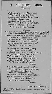 نسخه انگلیسی We'll sing a song, a soldier's song, Chorus Soldiers are we, In valley green, on towering crag, Chorus Sons of the Gael! Men of the Pale! Soldiers are we... Chorus |