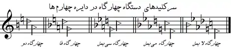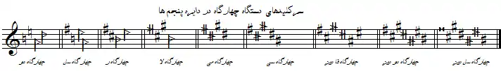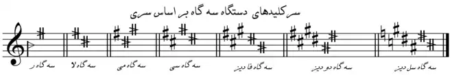دستگاههای موسیقی ایرانی، معمولاً با سرکلیدهایی ساده اجرا میشوند و اجرای آن و سازی که تمام این فواصل را اجرا کند مشکل است؛ ولی از آنجا که فواصل موسیقی ایرانی به ۲۴ قسمت تقسیم شدهاست، از نظر علمی باید قوانین آن را دانست.[1] در هفت دستگاه موسیقی ایرانی، دستگاه ماهور و راستپنجگاه در سرکلید با گام ماژور تفاوتی ندارند. گامهای شور، نوا و همایون سرکلید مشترک دارند و سهگاه و چهارگاه دارای دو علامت تغییردهندهٔ مُختص موسیقی ایرانی در سرکلید هستند.