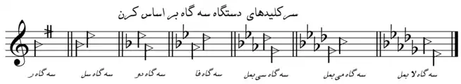 سرکلیدهای کرندار در سهگاه، پایینرونده و بر اساسِ «دایرهٔ چهارمها» است. در ابتدا با «سی کرن» و «فا سری» شروع میشود و سپس ترتیب نتهای تغییرکرده بدین شرح است: (سی / می)، (می / لا)، (لا / ر)، (ر / سل)، (سل / دو)، (دو / فا).