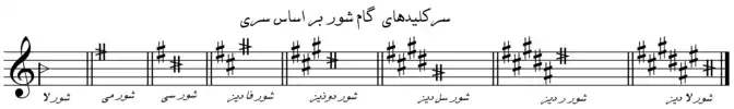 دستگاه شور با سرکلیدهای سُری به ترتیبِ «دایرهٔ پنجمها» است. در این ترتیب که از شورِ لا (استثنائاً با سی کرن) شروع میشود، نتهای تغییردهندۀ بعدی که تبدیل به «سُری» میشوند عبارتند از: فا، دو، سل، ر، لا، می، سی.[2]