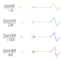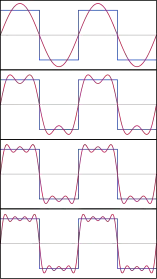 چهار جمع جزئی (سری فوریه) با طول ۱ ، ۲ ، ۳ و ۴ جمله ای، که نشان میدهد چگونه تقریب با یک موج مربعی با افزایش تعداد جملهها بهبود مییابد.