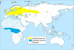| Yellow: Breeding (summer only) Blue: Non-breeding winter visitor Cross-hatched: migration. | |
