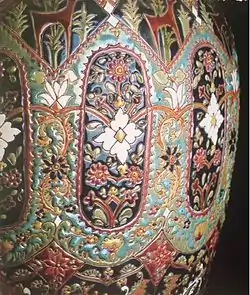 - ب) استفاده از رنگدانههای معدنی که بعد از پخت سفالینههای منقوش در کوره، نقش و نگارها ثابت خواهندبود. نقاشی با رنگهای قابل پخت، به چند روش است که میتوان از آن جمله به نقاشی زیرلعابی و رولعابی اشاره کرد.