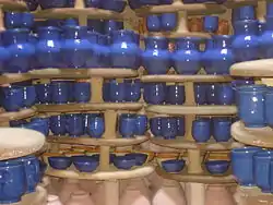 لعابکاری برای لعاب کاری (رنگ لعابی دادن به سفالینههای کوچک، آنها را در رنگی که میخواهند فرو میبرند تا همه جای آنها از لعاب پوشیده شود و سپس رنگ کَعْبْ آنها را پاک میکنند تا هنگام پختن که سفالینهها را روی هم میچینند، به یکدیگر نچسبند. برای لعاب کاری ظرفهای بزرگ، رنگ را با کاسه کوچکی روی میریزند.