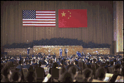 نیکسون و چو انلای در ضیافتی سخنرانی میکنند..