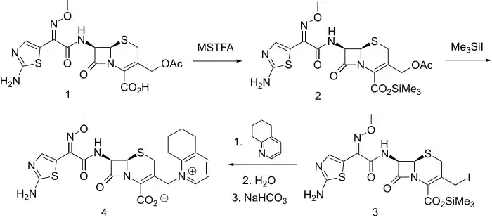 - Brown RF, Kinnick MD, Morin JM, Vasileff RT, Counter FT, Davidson EO, et al. (August 1990). "Synthesis and biological evaluation of a series of parenteral 3'-quaternary ammonium cephalosporins". Journal of Medicinal Chemistry. 33 (8): 2114–21. doi:10.1021/jm00170a011. PMID 2115587.