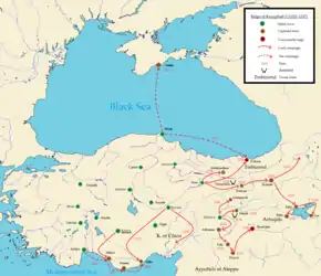 - در جنگ ضد صلیبیون، زیرا یکی از راههایی که به سرزمین بیتالمقدس میرسید، آسیای صغیر بود که در اختیار صلیبیها قرار داشت.