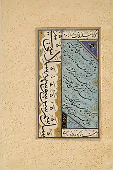 برگی به خوشنویسی سلطان محمد بن نورالله که با آبرنگ و طلا رنگین شده است.