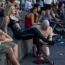 یک مرد نیمه برهنه مطیع در حال تمیز کردن چکمه دومیناتریکس خود (بالباس چرمی) در یک پارک عمومی در انگلستان، ۲۰۱۱