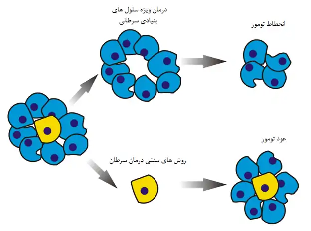 باور بر این است که شیمی درمانی مرسوم، سلولهای در حال تمایز یا تمایز یافته را که بخش اعظم تومور را تشکیل میدهند از بین میبرد. اما سلولی جایگزین آنها نمیشود. جمعیتی از CSCها که به آن رشد کردهاند، میتوانند دست نخورده باقی بمانند و بعداً عود کنند.
