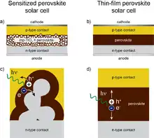 سلولهای خورشیدی پروسکایت بسته به نوع نقش پروسکایت در سلول و یا ماهیت الکترودهای بالایی و پایینی، در ساختارهای متفاوتی ساخته میشوند. سلولهایی که در آن بارهای منفی توسط الکترود شفاف پایینی (آند) استخراج میشوند را میتوان به دو دسته "حساس شده" که در آن پروسکایت عمدتاً نقش جاذب نور را داشته و بارها توسط مادهٔ دیگری جمعآوری میشوند، و "لایه نازک" که در آن ترابرد الکترون و یا حفره درون بالک پروسکایت انجام میشود، تقسیم کرد. در نوع اول، مشابه فرایند حساس سازی در سلولهای خورشیدی رنگدانهای، پروسکایت به عنوان جاذب بر روی فیلم نیمرسانای مزومتخلخل - غالباً - نشانده میشود. الکترونهای تولید شده در اثر تابش نور، از پروسکایت به لایهٔ مزومتخلخل منتقل شده و درون این لایه به سمت الکترود حرکت کرده و در مدار خارجی استخراج میشوند. در نوع دوم، پس از جذب نور و تولید بار، ترابرد هر دو نوع بار مثبت و منفی و انتقال آنها به الکترودها، درون فیلم پروسکایت انجام میشود.