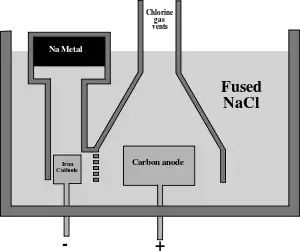 به طور طبیعی دمای ذوب سدیم کلرید خالص ۸۰۱ درجه سانتی گراد است اما در این فرایند، با افزودن مقداری کلسیم کلرید دمای ذوب تا ۵۸۷ درجه سانتی گراد کاهش مییابد که این روش از نظر اقتصادی و مصرف انرژی مقرون به صرفه تر است.