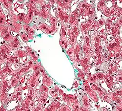![]() سلولهای کوپفر لبول مرکزی همراه با سیتوپلاسم دانهای خاکستری در ترمیم کبد آسیب دیده. بافتبرداری کبد. رنگآمیزی تریکروم. | |