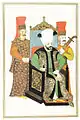 سلیمان ثانی نشسته بر تخت و دو ینیچری ایستاده در پشت سلطان