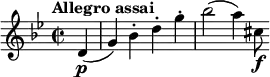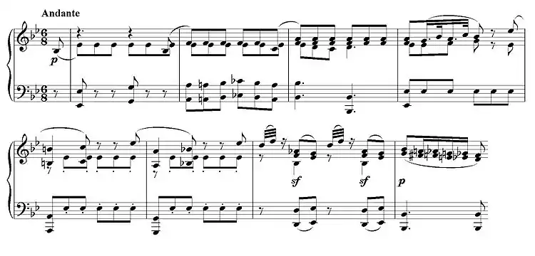 - موومان اول شروع تیرهای با ویولاها دارد که توسط زهیها در منطقه پایین صوتی همراهی میشود. تم اول بدین شرح است: