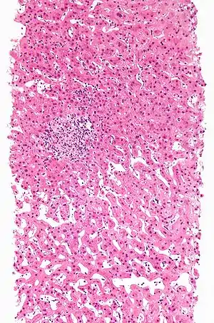 | هپاتیت ناشی از دارو با گرانولوماتا. علل دیگر با تحقیقات گسترده حذف شدند. بافتبرداری کبد. H&E stain. | |