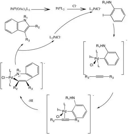 - Larock, R. C.; Yum, E. K. (1991). "Synthesis of indoles via palladium-catalyzed heteroannulation of internal alkynes". Journal of the American Chemical Society. 113 (17): 6689. doi:10.1021/ja00017a059.