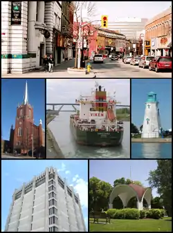 ![]() از بالا چپ: تقاطع خیابان سنت پاول و کویین، کلیسای سیلور اسپایر، یک کشتی در حال عبور از کانال ولند، فانوس دریایی، برج آرتور اسکمون در دانشگاه بروک، پارک مونتهبلو | |