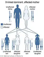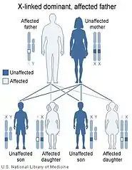 | توارث وابسته به کروموزوم ایکس بسته به آن است که کدام یک از والدین (مادر = تصویر چپ، پدر=تصویر راست) حامل ژن معیوب باشد. | |||||||