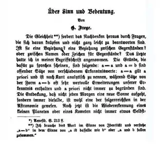 - "On Sense and Reference" ["Über Sinn und Bedeutung"], Zeitschrift für Philosophie und philosophische Kritik, vol. 100 (1892), pp. 25–50, esp. p. 31.