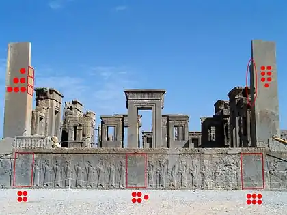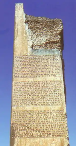 یک ستون از سنگنبشته ایوان کاخ تچر نگاره پایینی: ۱) متن پارسی سنگنبشته ایوان کاخ تچر ۲) متن ایلامی سنگنبشته ایوان کاخ تچر ۳) متن بابلی سنگنبشته ایوان کاخ تچر ۴ و ۵ و ۶) سنگنبشته نمای جنوبی کاخ تچر ۷) ستونی دیگر از سنگنبشته ایوان کاخ تچر
