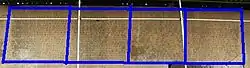 جایگاه کتیبه های پیبنای دیوار جنوبی تخت جمشید. از چپ به راست: پارسی، پارسی، عیلامی و بابلی. →شرق و غرب←