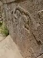 واقع در بخش میانی: جزئیات سر یک ایزدبانو (ناپیریشا؟) که بر تخت نشسته و کلاهی شاخدار بهسر دارد. بالای سر او ابری راهراه از دود یا بخار نقش شدهاست.