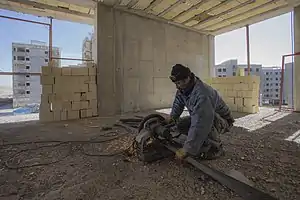 یک آهنگر ساختمانی در حال کار با ماشین سنگ جت