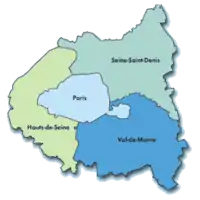 شهرستان های سن-سن-دنی (ناحیه بالایی)، وال دو مارن (ناحیه پایینی سمت راست) و او-دو-سن (ناحیه سمت چپ) سه شهرستان کوچک فرانسه هستند که در مجموع شهر پاریس یا شهرستان پاریس (ناحیه داخلی) را احاطه کردهاند.