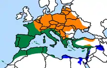 | Range: orange, summer; green, all year; blue, winter | |