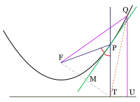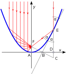 در شکل مقابل F نقطه کانون سهمی، P نقطه ای دلخواه روی سهمی، PT عمودی بر خط هادی سهمی و MP نیم ساز زاویه FPT∠ است. Q نقطه ای دیگر روی سهمی است و QU نیز عمود بر خط هادی است. ما میدانیم FP = PT و FQ = QU. به وضوح، QT > QU, پس QT > FQ. اما از طرفی تمام نقاط روی MP از F و T به یک فاصله هستند. یعنی هیچ نقطه ای روی سهمی نیست که روی MP باشد؛ که یعنی خط مماس به سهمی که از نقطه T میگذرد، نیمساز FP و PT است. با توجه به این که زاویه تابش نور از خط مماس به منحنی با زاویه بازتاب برابر است، میتوان دریافت که پرتو بازتاب در راستای همان خطی است که به F میرود.