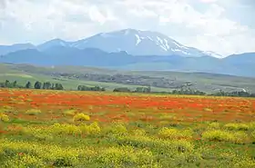در دامنههای کوهستان سهند، زیباترین درههای آبرفتی همراه با روستاها، باغها و کشتزارها، جلوههایی شگفت پدیدآورده است.[7] کوهستان سهند بعد از سبلان یکی از بزرگترین و مهمترین برجستگیهای آذربایجان و از معروفترین کوههای آتشفشان و خاموش ایران است که در ۵۰ کیلومتری جنوب تبریز قرار گرفتهاست.