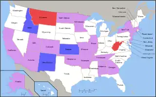 آبی کاکسهای فقط-دمکرات را نشان میدهد (3), قرمز ایالتهای برگزارکنندهٔ فقط-جمهوریخواه را نشان میدهد (2), و بنفش ایالتهای برگزار کنندهٔ انتخابات برای هر دو حزب را نشان میدهد (19). Notes: ساموآی آمریکا (not shown) is Democratic only.